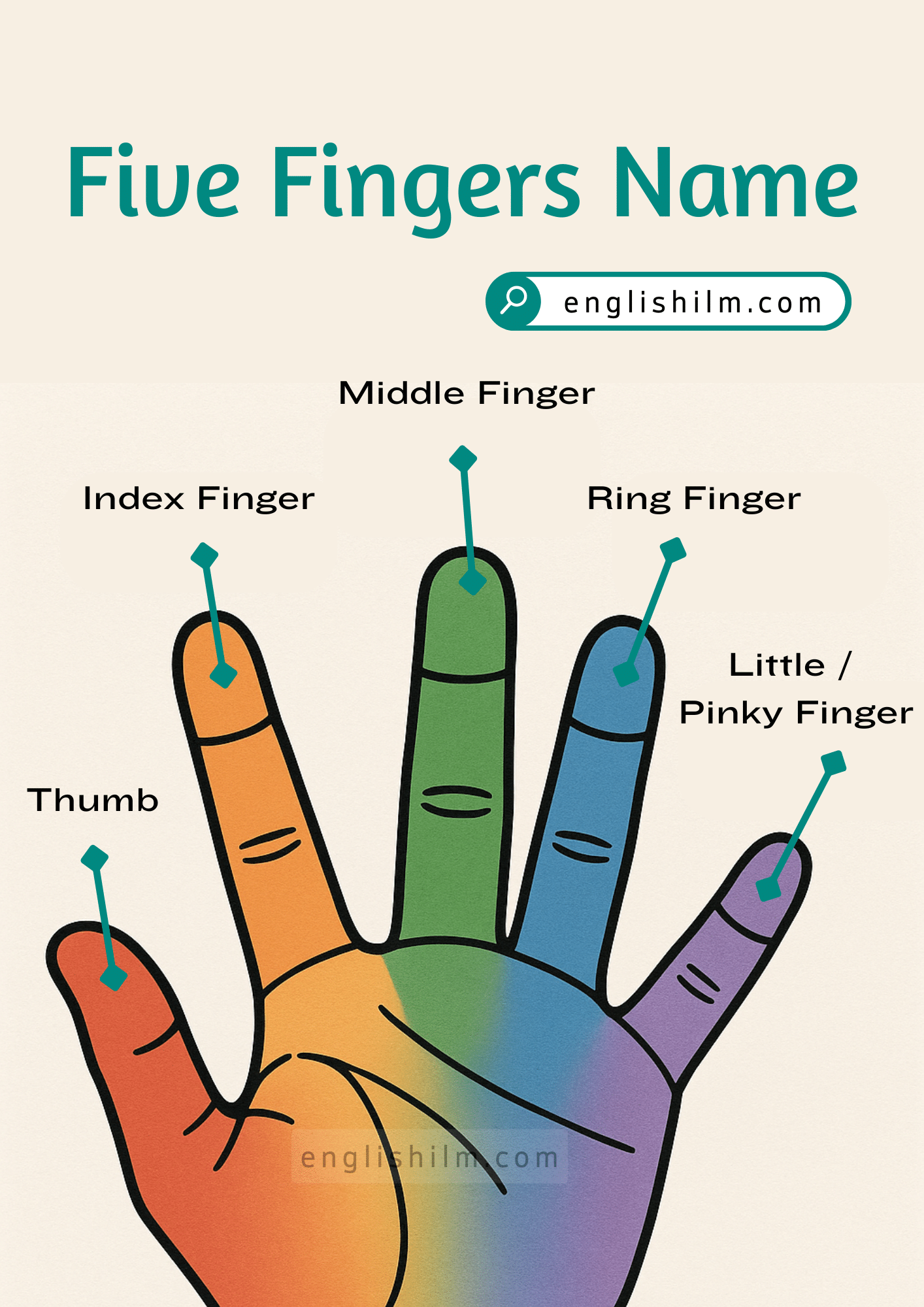 Fingers are the five small parts that come out of the hand. We use them to hold, touch, write, eat, and do many activities every day. Each finger has its own name in English.